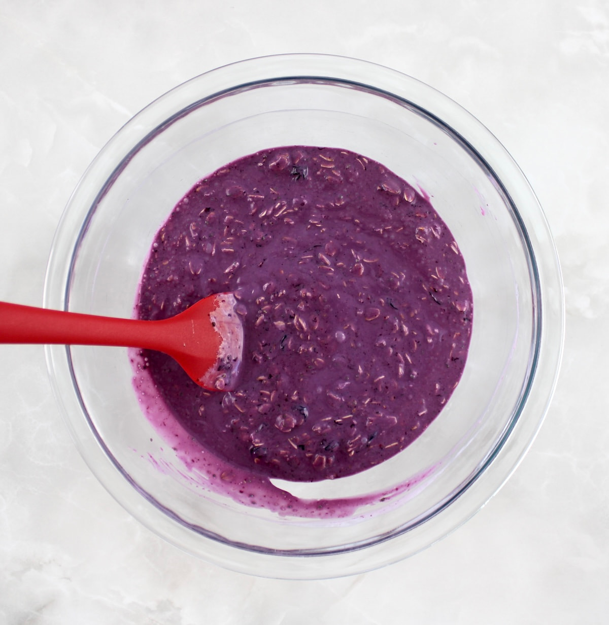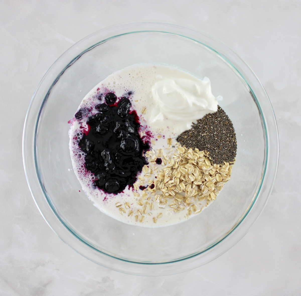 In a large mixing bowl, add in the rolled oats, coconut milk, Greek yogurt, chia seeds and vanilla extract.