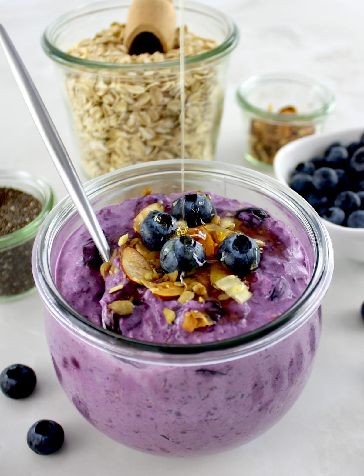 - When you’re ready to serve, top with some fresh blueberries, toasted almonds and a drizzle of honey.