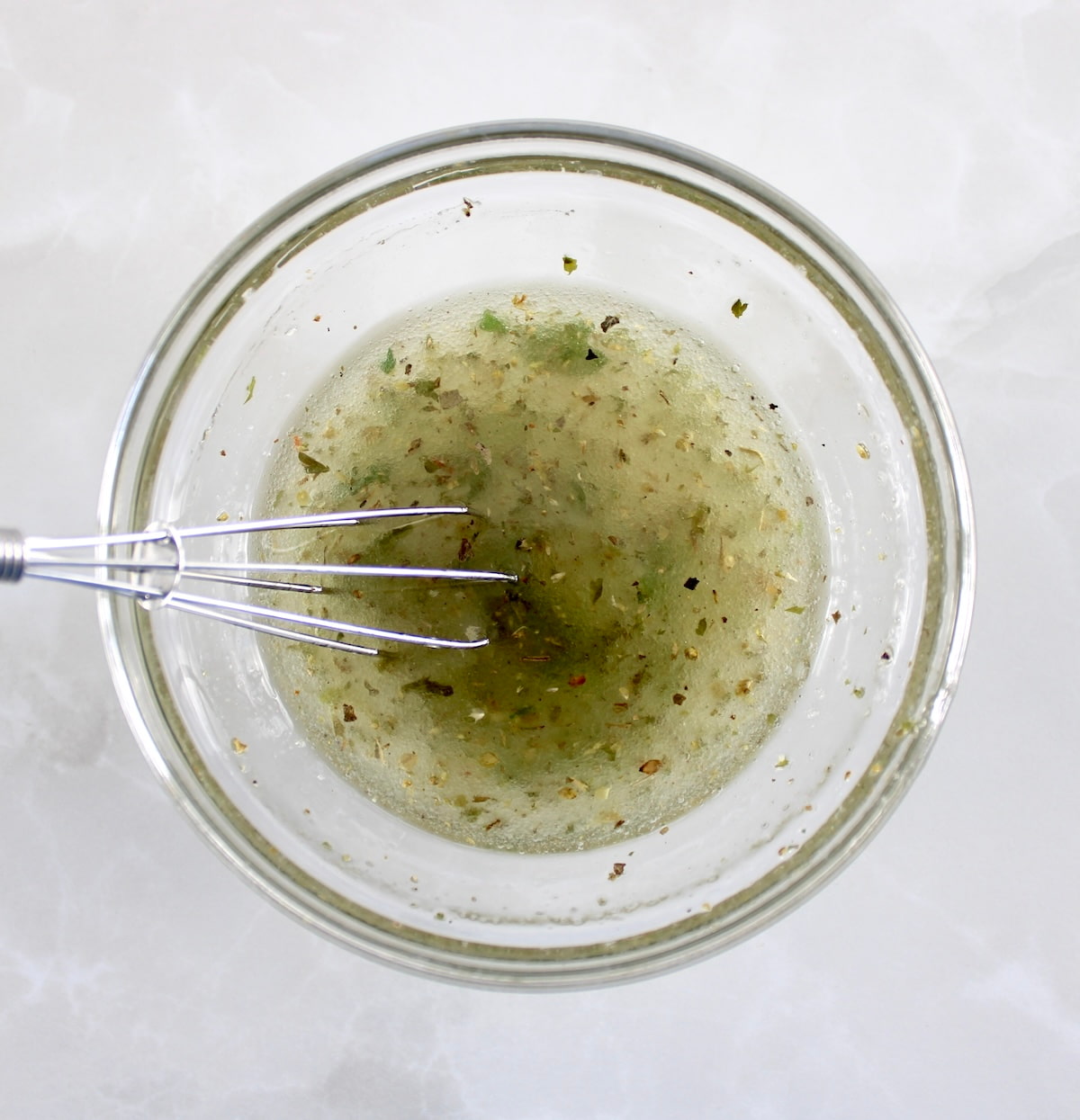 - Add the olive oil based marinade, white wine vinegar and dried oregano to a small mixing bowl. Whisk until combined, then set aside.