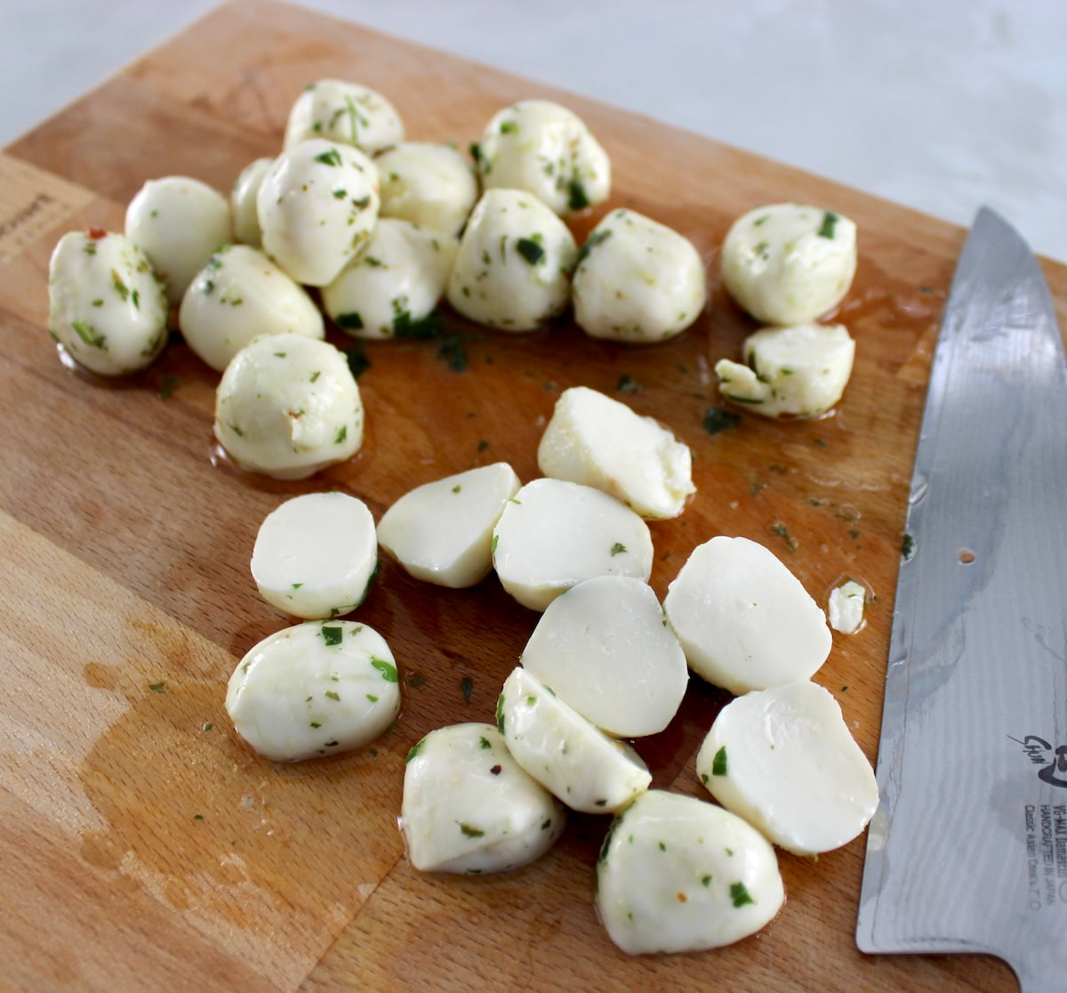 - Likewise, slice the mozzarella balls in half and set them aside.