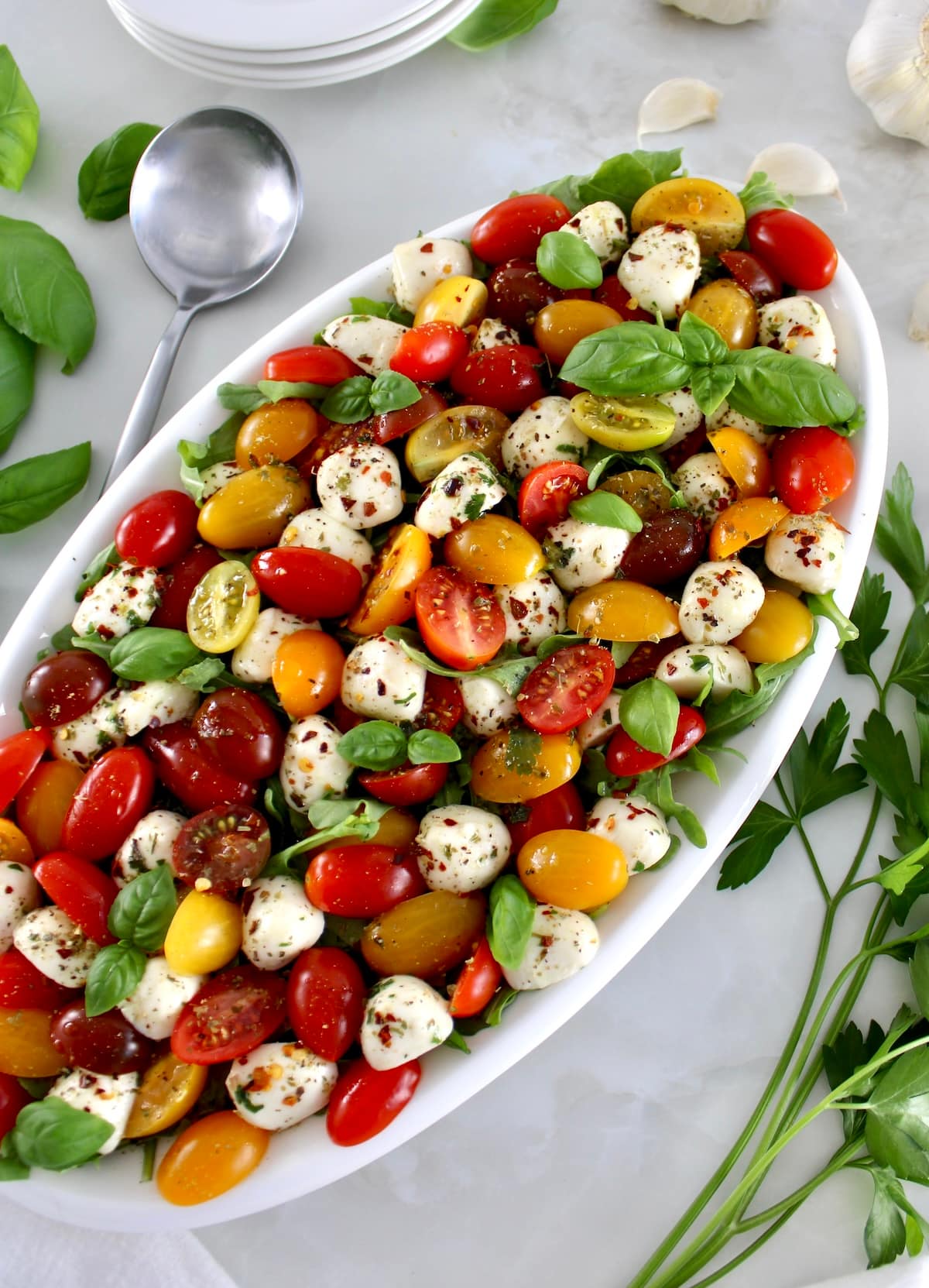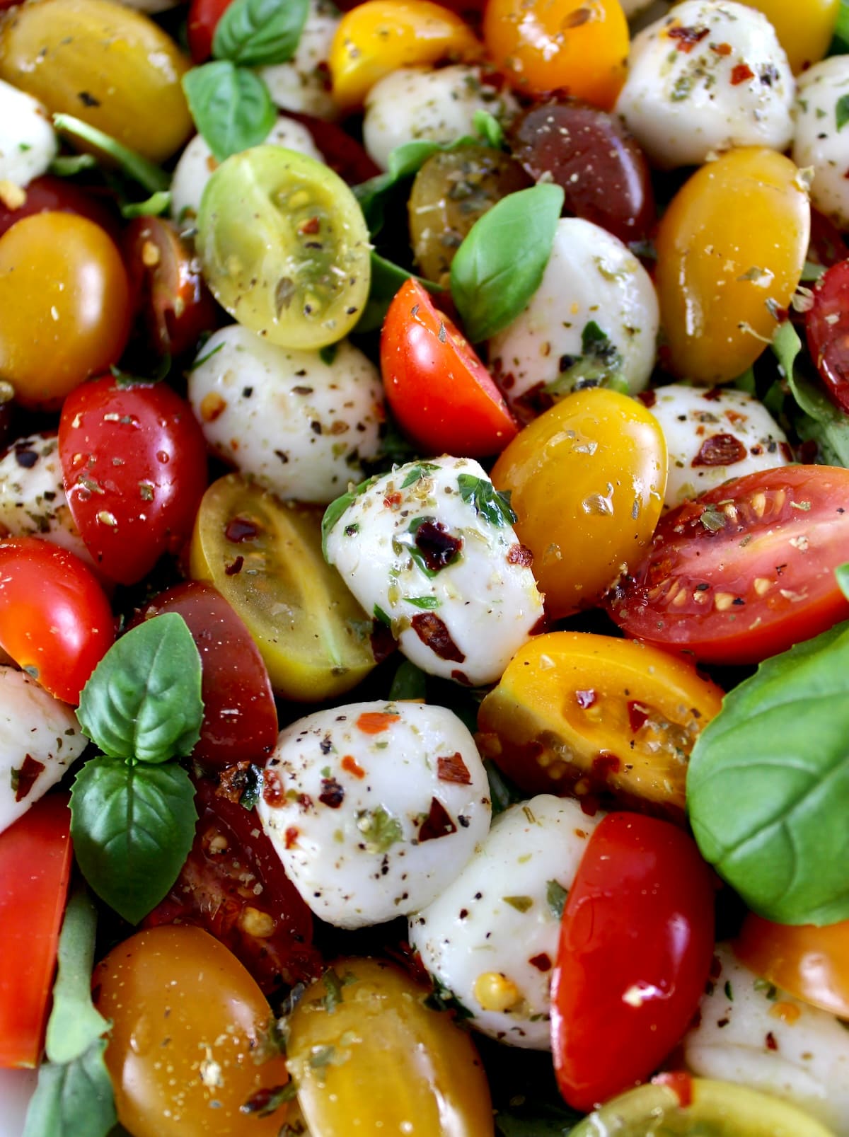 - Red pepper flakes: for a little spicy kick, add in a pinch of red pepper flakes. The marinated mozzarella cheese that I used already had some in it.