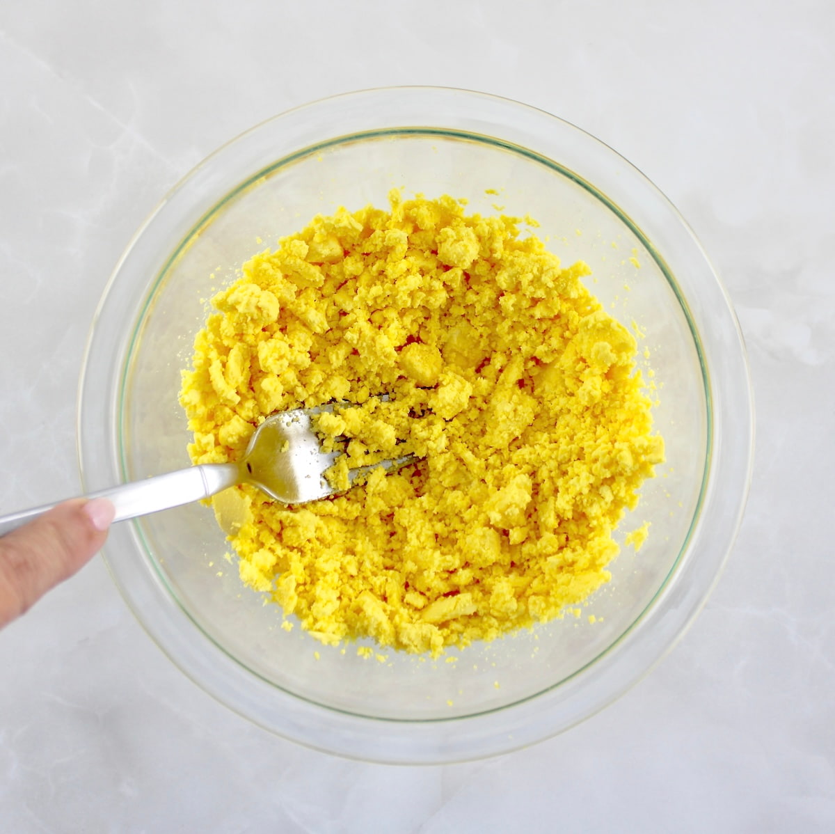 - Cut each egg in half, scooping out the yolk into a mixing bowl. Then mash with a fork.