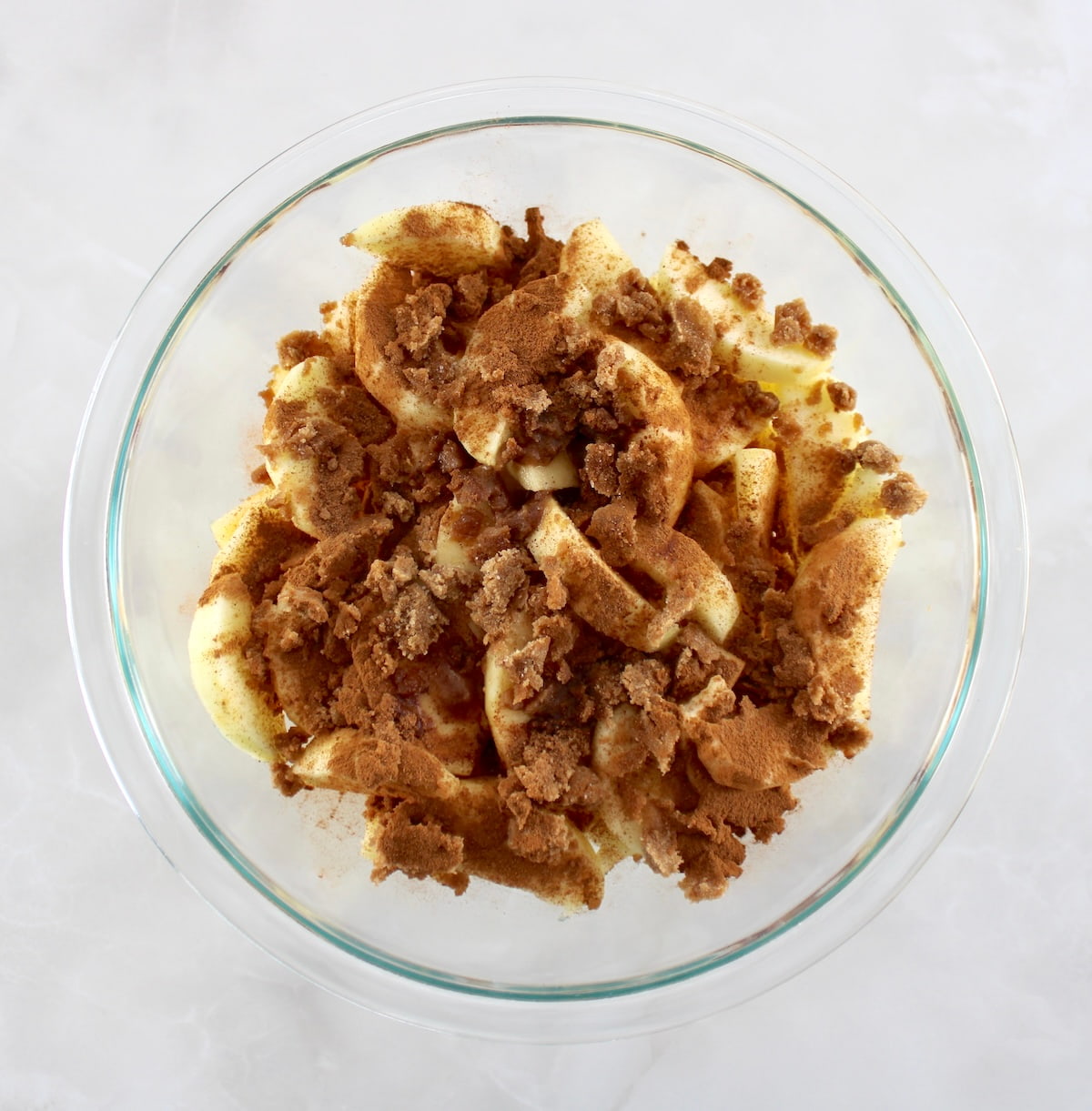 - Add the apples to a mixing bowl, then sprinkle the brown sweetener, cinnamon, nutmeg, salt and vanilla over the top.