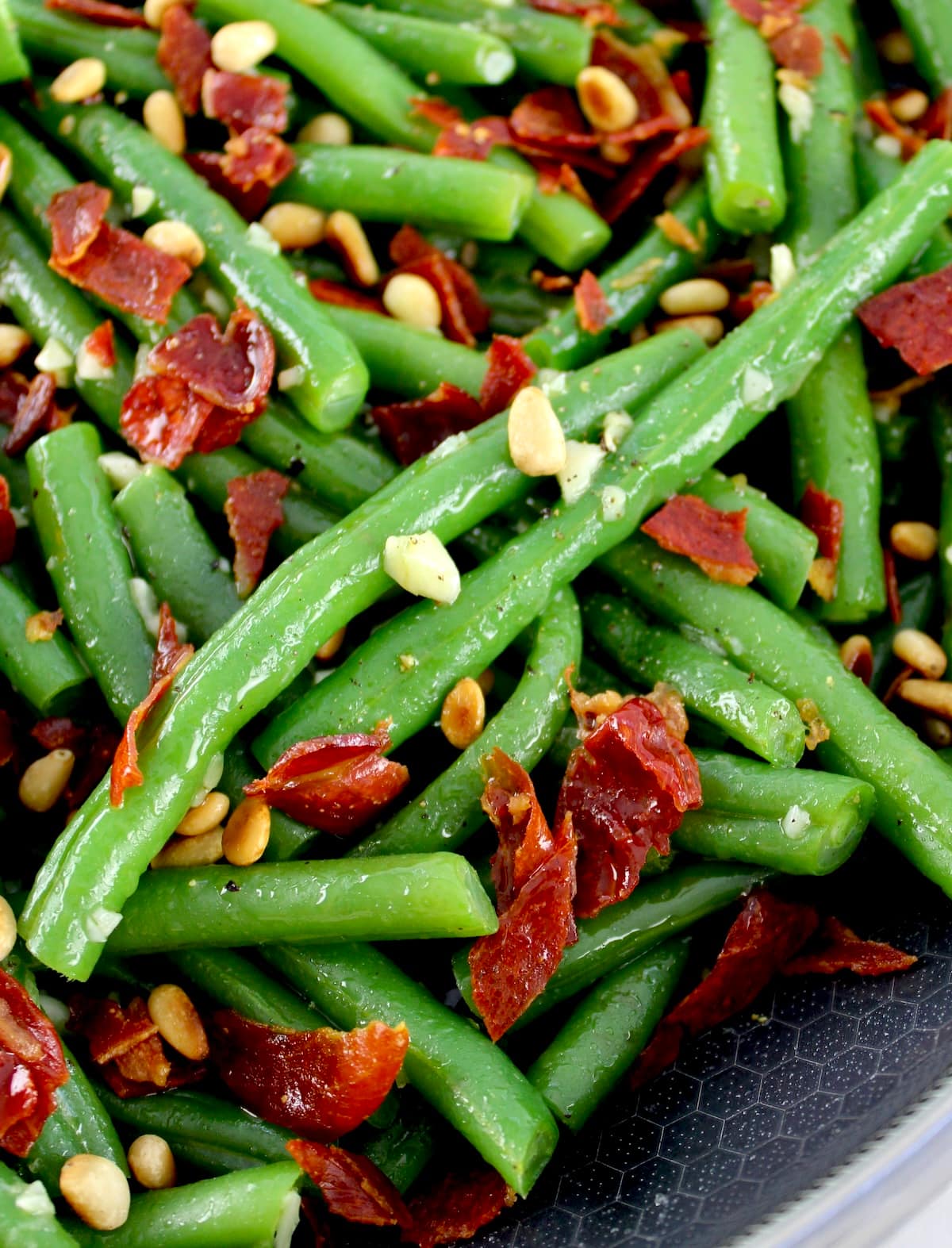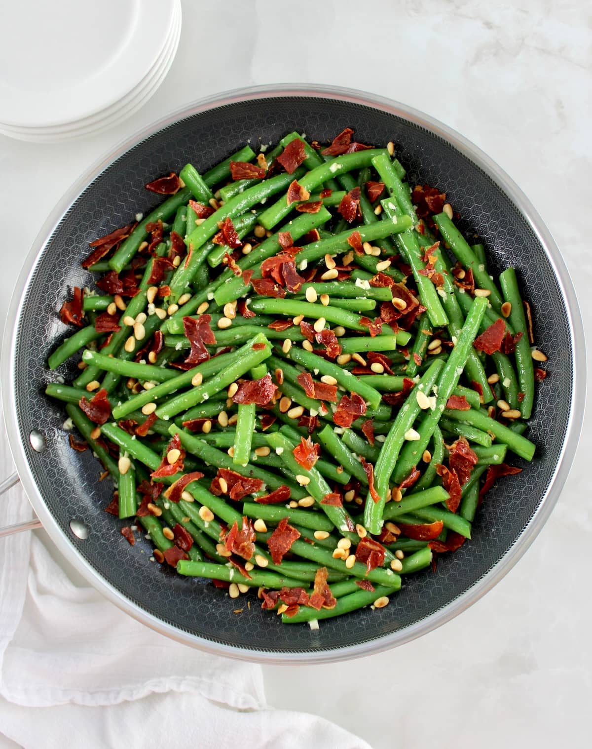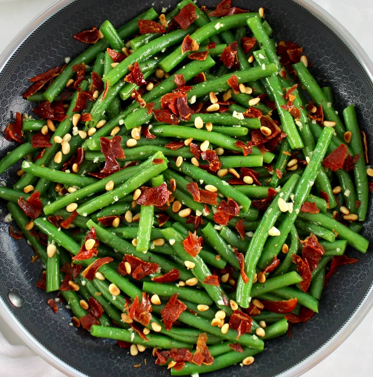 These Green Beans with Crispy Prosciutto are tossed in garlic butter and then topped with savory, crispy prosciutto and toasted pine nuts. This easy recipe turns simple green beans into a delicious side dish you’ll want at every holiday table and weeknight dinner.