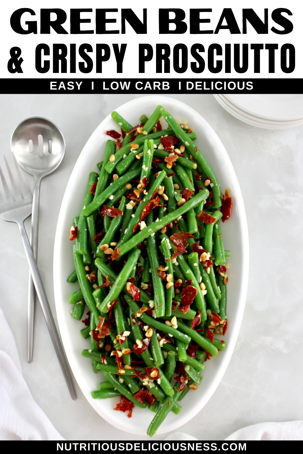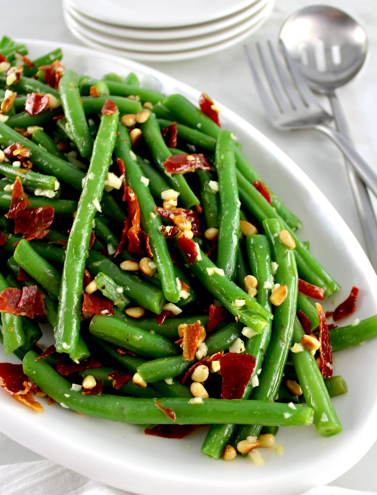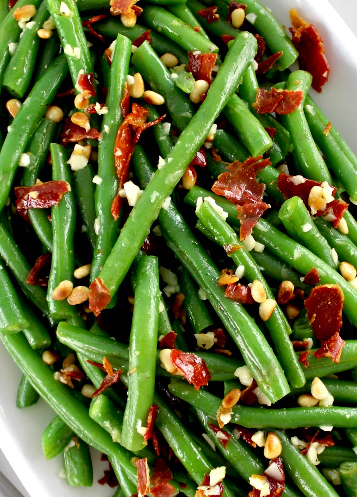 These Green Beans with Crispy Prosciutto are tossed in garlic butter and then topped with savory, crispy prosciutto and toasted pine nuts. This easy recipe turns simple green beans into a delicious side dish you’ll want at every holiday table and weeknight dinner.