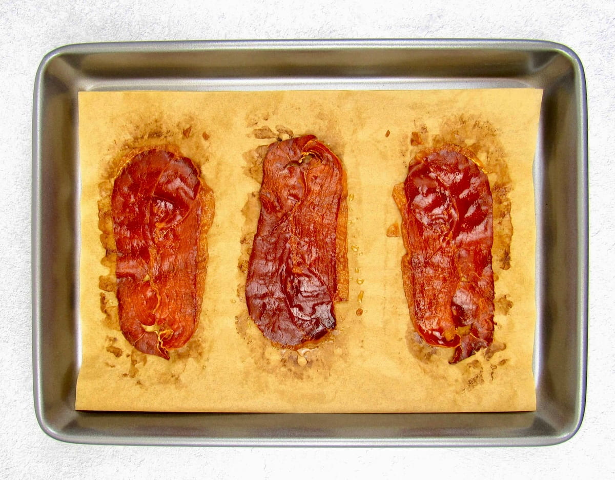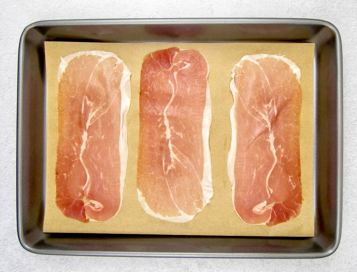 - Add the prosciutto to a small baking sheet lined with parchment paper.