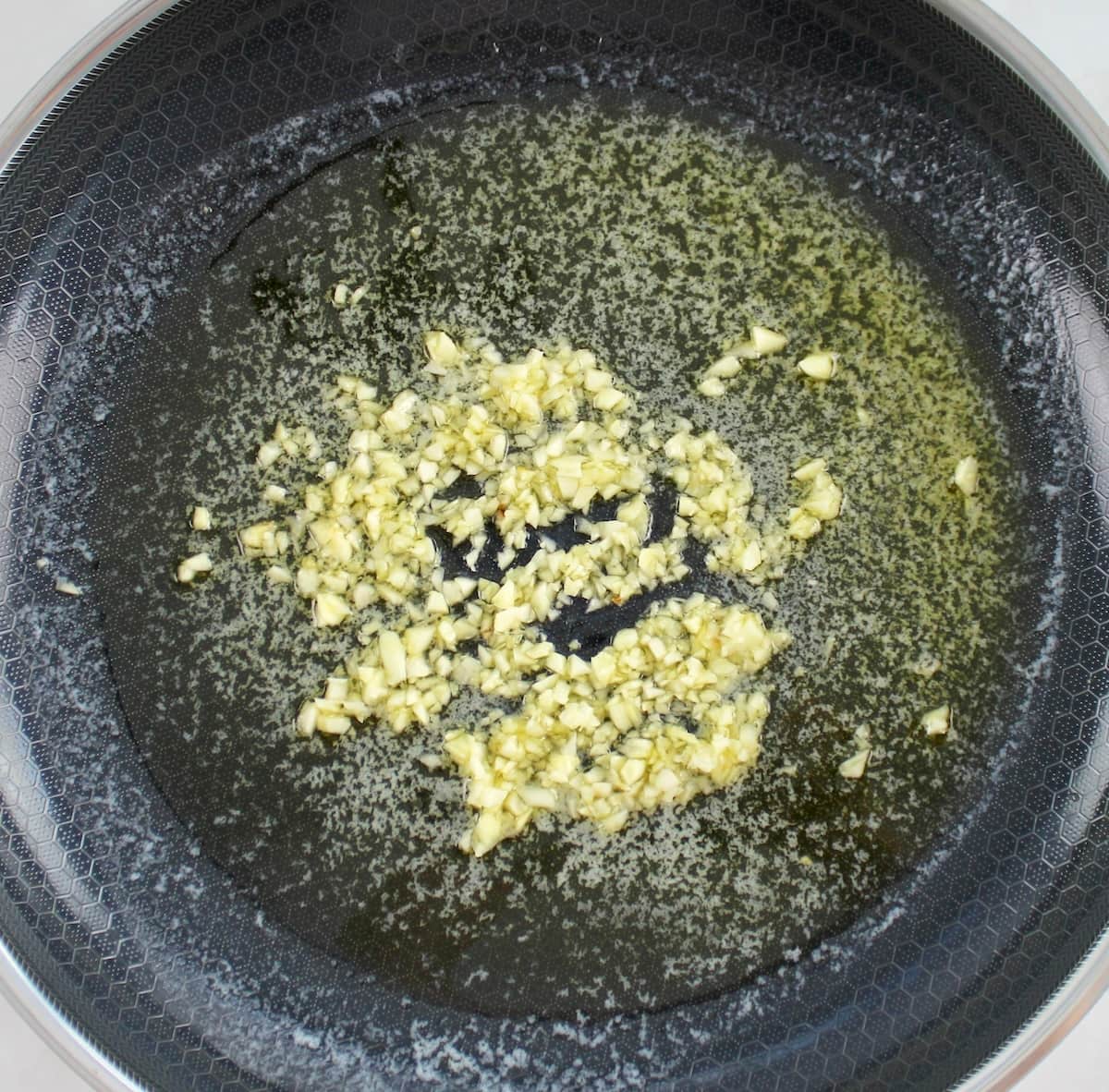 - Heat a large skillet to medium low and add in the butter. Once melted, add in the garlic and sauté for about 20 seconds, making sure not to brown it or it will become bitter.
