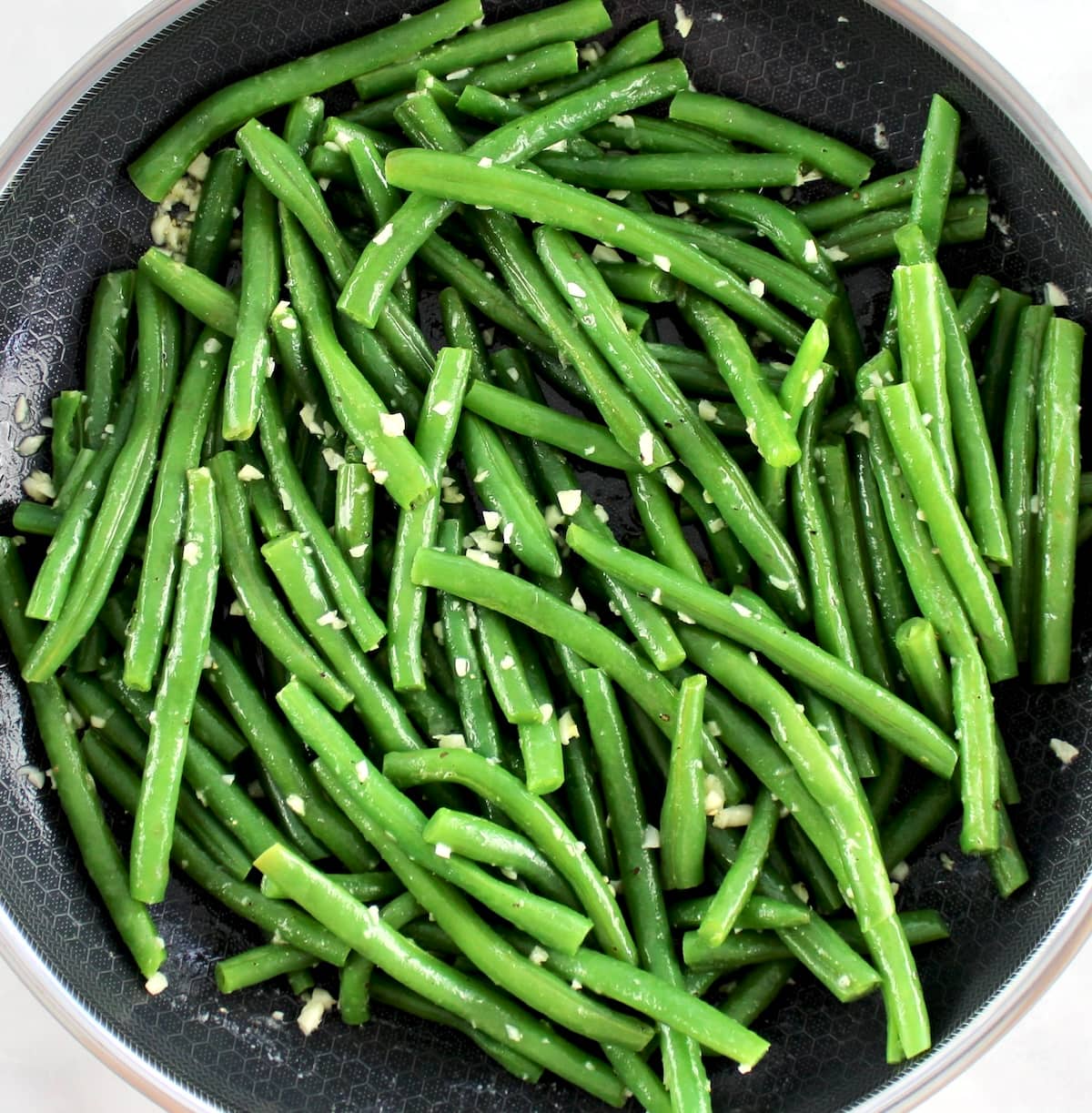 - Add in the green beans and toss in the garlic butter. Add in the ground black pepper and once heated through, turn off the heat.