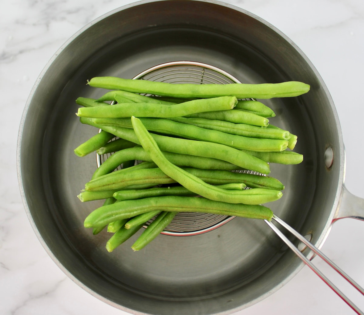 Bring a large pot of water to a boil. Add in a good amount of salt and the green beans, then boil for 8 minutes.