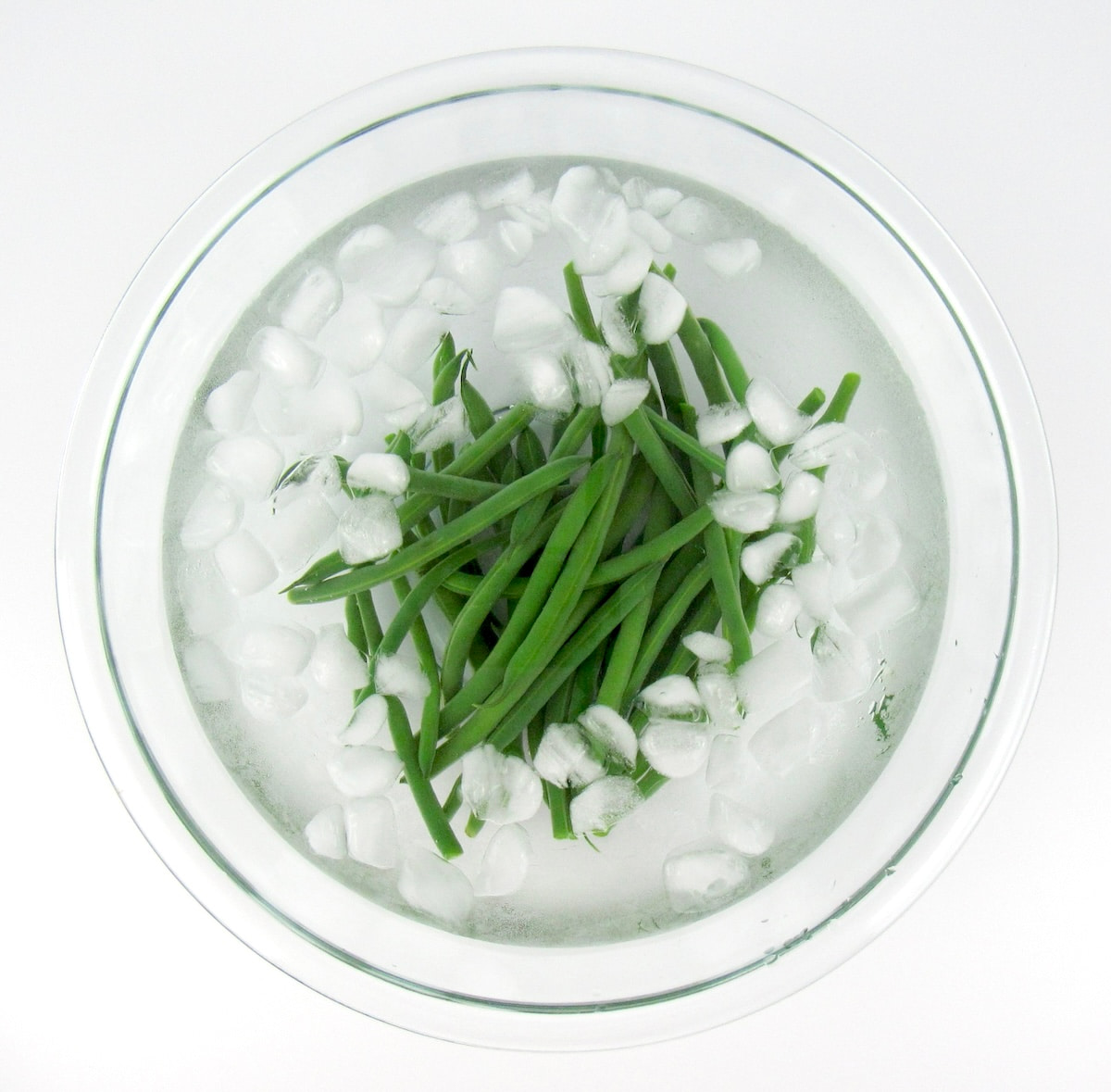 - Plunge the green beans into a bowl of ice water to stop the cooking and set the beautiful green color. Once cooled, drain and dry with paper towels. Then set aside.