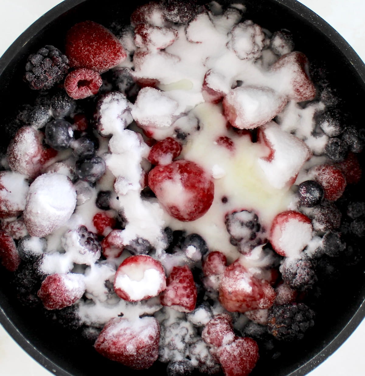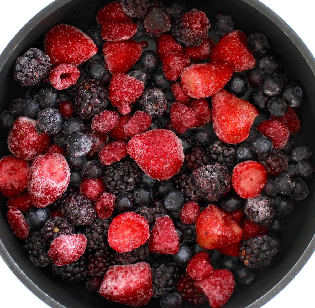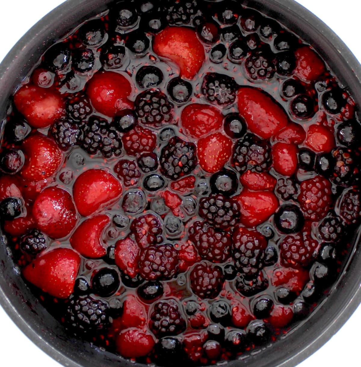 Simply pick up a bag of frozen berries that have a mix of strawberries, blueberries, blackberries and raspberries. They’re already cleaned and ready to use. The rest is so easy, you won’t believe it. After you try this method, you’ll turn your nose up at the store bought stuff and make your own from now on.