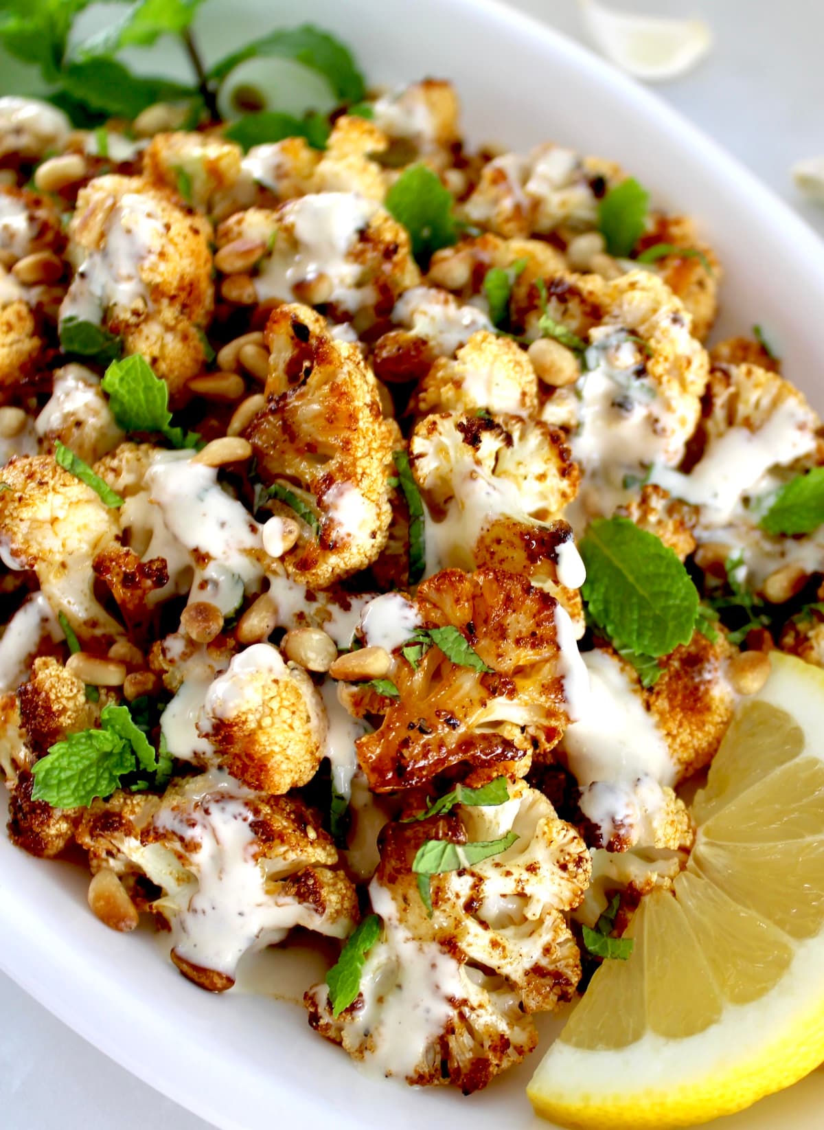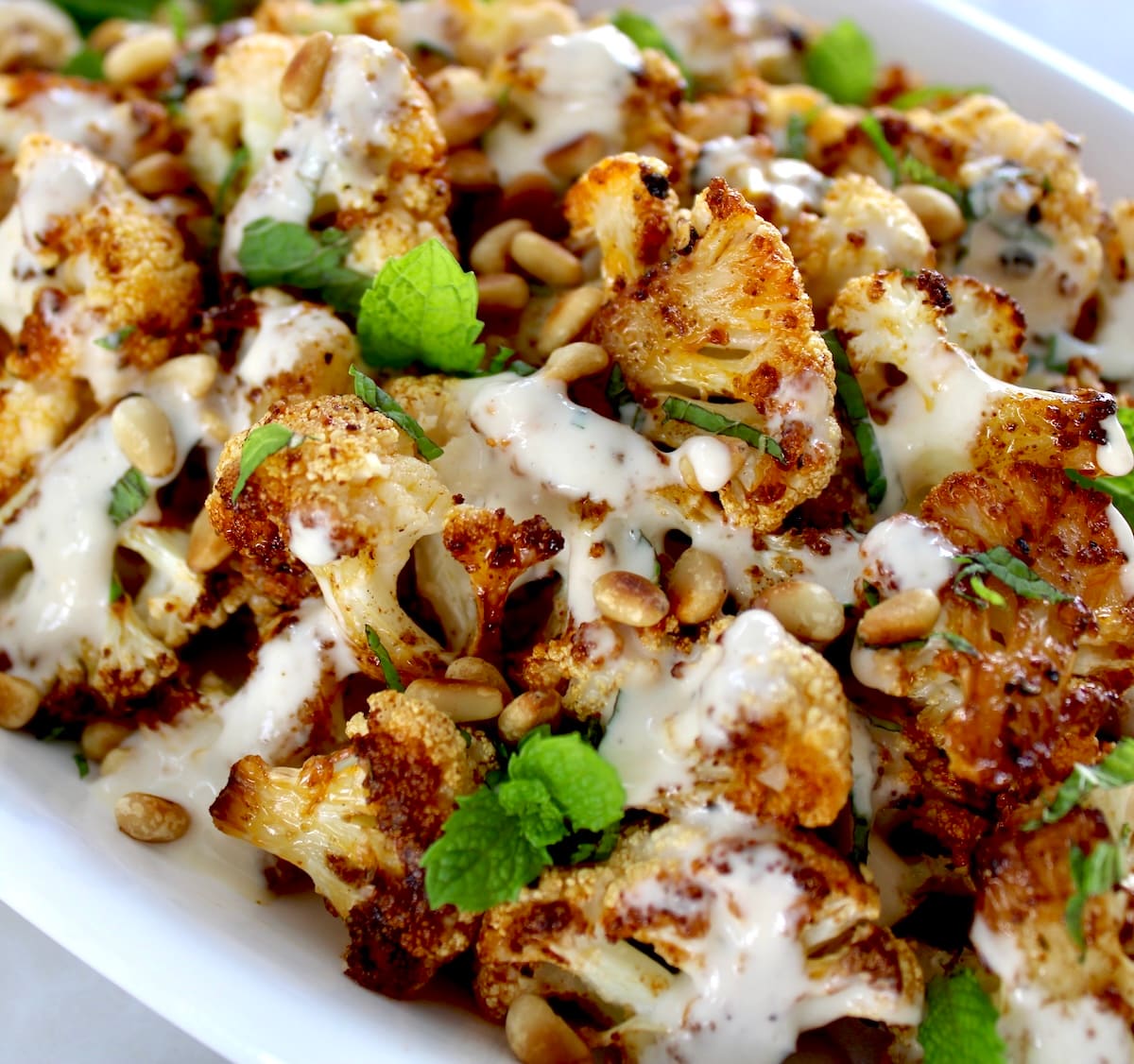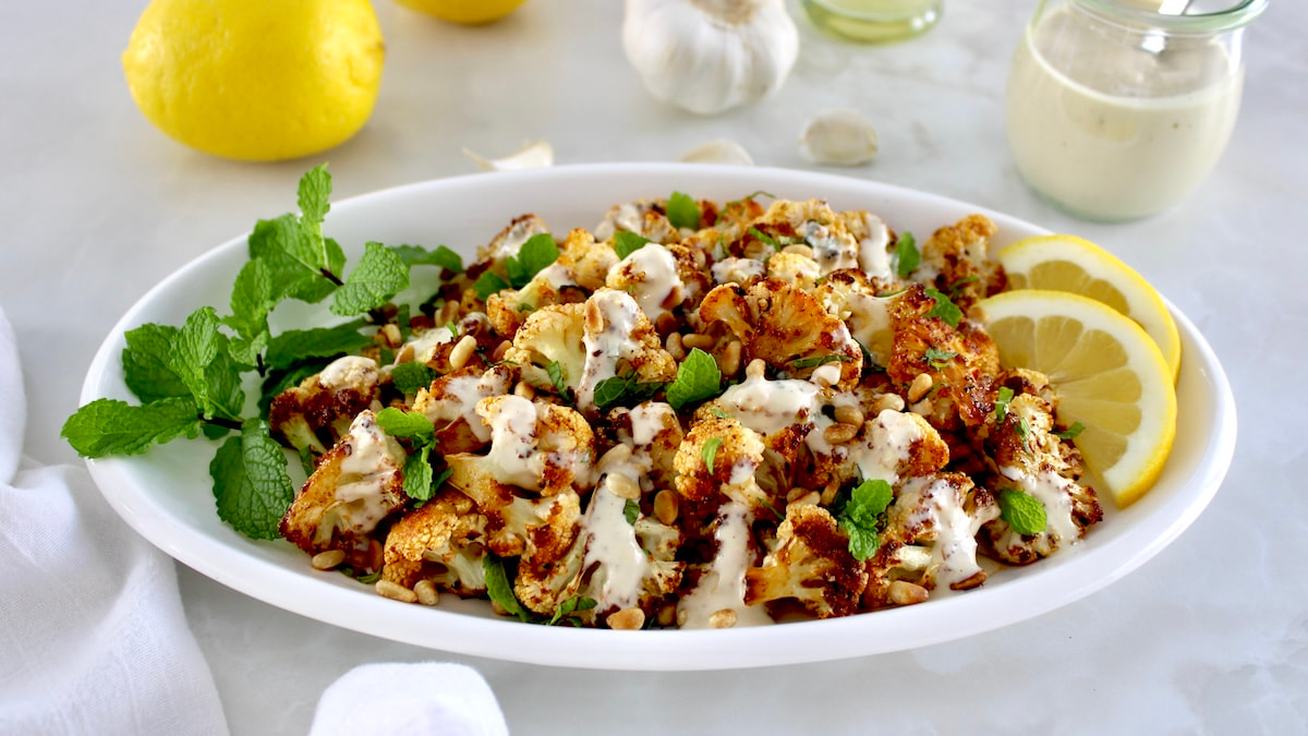 Fresh cauliflower is seasoned and roasted until caramelized, served with toasted pine nuts, fresh mint and a drizzle lemon tahini dressing. It’s a creative and tasty way to prepare cauliflower that makes an ideal side for any dinner.