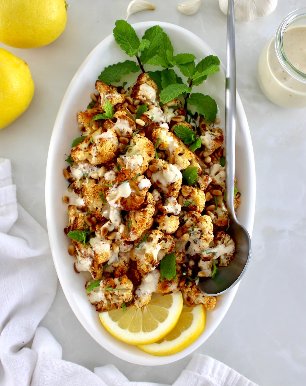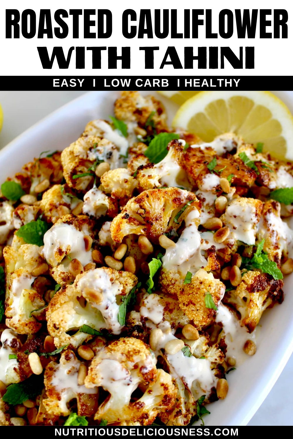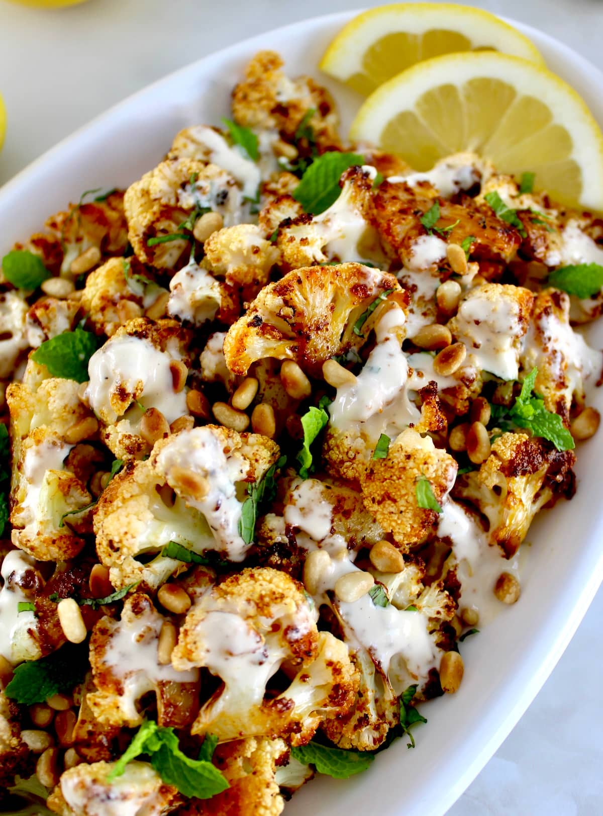 Fresh cauliflower is seasoned and roasted until caramelized, served with toasted pine nuts, fresh mint and a drizzle lemon tahini dressing. It’s a creative and tasty way to prepare cauliflower that makes an ideal side for any dinner.
